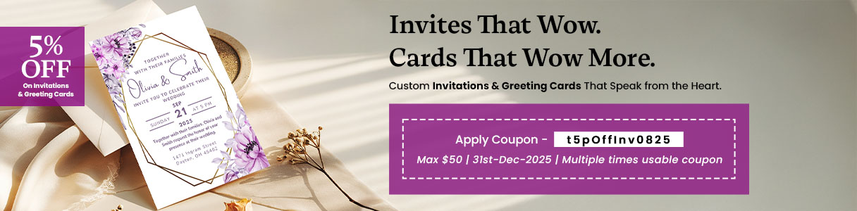 Apply coupon code: t5pOffInv0825 to get 5% Off on Invitations & Greeting Cards (max $50)
